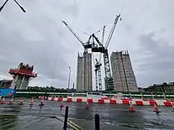 A revised planning application, incorporating a similar mixed use, with a lower skyline, was approved by the Council in December 2010.[10] Work to strengthen the railway tunnels under Haymarket began in 2013 in preparation for the construction of the new £200m development above which is to include a 320-space underground car park.[11] This involves grouting between the tunnel lining and the surrounding ground, and drilling and inserting metal bars within the brick lining. Due to line operations, works access was limited in the north tunnel to between midnight and 5am four nights of the week and in the south tunnel from 1am to 9.30am one night a week.[12]