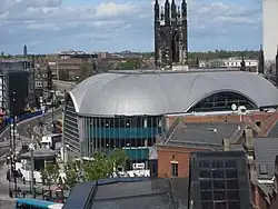 Haymarket Hub with parts of Newcastle University and St Thomas' Church in the background
