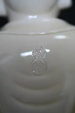 He Chaozong (Chinese: 何朝宗; pinyin: Hé Cháozōng) was a celebrated early 17th-century Chinese potter. He Chaozong fashioned mainly Buddhist white porcelain statuary in the tradition of the Dehua kilns in Fujian Province, known in the west as Blanc-de-Chine. Little documentary evidence remains for He Chaozong apart from extant examples of his ceramic art. A gazetteer entry for 1763 mentions him with other art notables of the Ming dynasty and establishes that the artist had earned a considerable reputation by his own day. His works identified by his seal are in an entirely different category than the usual Dehua statuary of the period and those later. They are thickly potted and exhibit an artistic expressiveness and creativity unmatched by thinner and standardized unsigned works. He Chaozong and the few other artists of the Dehua kilns were nearly unique in Chinese ceramic history which was characterized by anonymous and industrial scale production. Blumenfield in his Blanc de Chine presents the reader with what may be one of the few believable examples of the artist, replete with a hidden inscription visible to ultraviolet light. Of great interest is the manner of carving of the piece which shows none of the exuberant flowing robes of other examples of the master that may be simply just superficially attractive to the eye. Of additional interest in the Blumenfield book is the He Chaozong seal impressed on an additional Guanyin (p. 133) statue attributed to He Chaozong. All of the characters in the seal appear in reverse. This indicates that at least some seals on Dehua porcelain figures were akin to brands and perhaps of metal construction that could be mistakenly impressed in reverse. The outer borders of the Blumenfield seal, and the seal presented with the Manjusri statue accompanying this article, were both incised and evidently added after the characters were impressed on the bodies of the figures.