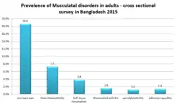35. ^ Zahid-Al-Quadir, Ahmad; Zaman, M. Mostafa; Ahmed, Shamim; Bhuiyan, Mahfuzur Rahman; Rahman, Md Mujibur; Patwary, Ismail; Das, Bidhu Bhushan; Hossain, Shaikh Amir; Paul, Sujat; Shahin, Abu; Rahman, Moshiur; Haq, Syed Atiqul (December 2020). "Prevalence of musculoskeletal conditions and related disabilities in Bangladeshi adults: a cross-sectional national survey". BMC Rheumatology. 4 (1): 69. doi:10.1186/s41927-020-00169-w. PMC 7739446. PMID 33323124.