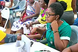 In 2015, life expectancy at birth was 66.18 years with males at 63.76 years and females at 68.66 years.[11] Infant mortality is at 37.37 per 1000 live births.[12] The total fertility rate is 4.06 children per woman among the 15 million Ghanaian nationals. In 2010, there were about 15 physicians and 93 nurses per 100,000 persons.[13]