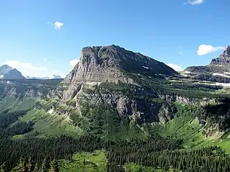 Heavy Runner Mountain (8,016 feet (2,443 m)) is located in the Lewis Range, Glacier National Park in the U.S. state of Montana.[3] The summit is a little over a mile east-northeast of Reynolds Mountain and is easily seen from the Going-to-the-Sun Road as well as Logan Pass. The mountain is named for the Blackfeet Indian Chief, Heavy Runner, who was massacred along with most of his encampment by Col. Eugene M. Baker's detachment on the Marias River on January 23, 1870.[4]