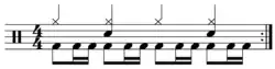 The rhythm in metal songs is emphatic, with deliberate stresses on beats by the drummer and other rhythm section players. Weinstein observes that the wide array of sonic effects available to metal drummers enables the "rhythmic pattern to take on a complexity within its elemental drive and insistency".[4] In many heavy metal songs, the main groove is characterized by short, two-note or three-note rhythmic figures—generally made up of 8th or 16th notes.