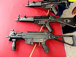 The Heckler & Koch UMP (Universale Maschinenpistole, German for "Universal Machine Pistol") is a submachine gun developed and manufactured by Heckler & Koch. Heckler & Koch developed the UMP as a lighter and cheaper successor to the MP5, though both remain in production.[4] The UMP has been adopted for use by various countries, including Brazil, Canada, and the United States. Some of the weapons saw limited service in the early years of the Iraqi insurgency, making them one of the more popular submachine guns being deployed by the U.S. military personnel in recent conflicts around the world.