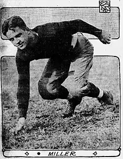Miller played for the University of Pennsylvania football team and switched positions from tight end to fullback in 1915.[1] [2][3] Miller also played for the Union Club of Phoenixville, and its later incarnation, the Union Athletic Association of Philadelphia. He was also a player-coach for the Frankford Yellow Jackets, prior to their NFL membership in 1924.
