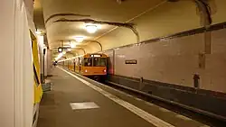 The station lies at "one and a half depth" because it is under buildings. Like many Berlin U-Bahn stations, it has an island platform and entrances at both ends, north and south. All are stairways; the station has no lift.[4] One of the two northern entrances is incorporated into a building on the corner of Köpenicker Straße, with offices and flats above. This building is also protected as an architectural landmark.[3] The other northern entrance and the southern entrance, at the corner of Schmidstraße, were also formerly incorporated into buildings, one of the models being entrances to London Underground stations; Neanderstraße was then unusually narrow and this line was the first use in Berlin of entrances set into buildings.[5][6] The other buildings were destroyed in World War II and those stairs have since led directly from the street.[3]