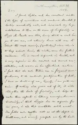 Just a week after the Garrisons' marriage,[8] Helen turned their home in Roxbury, Massachusetts – called "Freedom's Cottage" — into a salon for radical liberals.[10] In running her household as such, she welcomed anti-slavery friends and colleagues, turning their house into an important networking site for progressive reformers.[2] From there, Helen also maintained written correspondence with reformers including Theodore Dwight Weld of Lane Seminary; the secretary of the American Anti-Slavery Society, Elizur Wright; Gerrit Smith the philanthropist; Henry Grew the Quaker abolitionist; and the author Parker Pillsbury.[11]