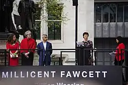 McCrory speaking at the unveiling of a statue of suffragist Millicent Fawcett in Parliament Square, London in 2018