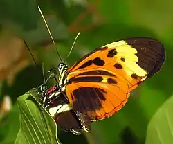 Because of the type of plant material that Heliconius caterpillars favor and the resulting poisons they store in their tissues, the adult butterflies are usually unpalatable to predators.[1] This warning is announced, to the mutual benefit of both parties, by bright colors and contrasting wing patterns, a phenomenon known as aposematism. Heliconius butterflies are thus Müllerian mimics of one another, and are also involved in Müllerian mimicry with various species of Ithomiini, Danaini, Riodinidae (Ithomeis and Stalachtis), and Acraeini, as well as pericopine arctiid moths. They are probably the models for various palatable Batesian mimics, including Papilio zagreus and various Phyciodina.