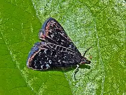 Heliothela wulfeniana has a wingspan of 16–19 mm.[4] The thorax and abdomen of these moths are brownish. Legs are whitish. The upperside of the forewings is dark brownish black, with small metallic lead-gray dots. A showy white spot is present on the paler brown hindwings. The outer margins of the wings are fringed with gray-bluish scales.[3]