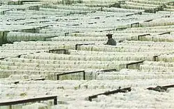 The period of 1880 to 1915 is considered the henequen boom years. In 1873, 31,000 bales were exported; 1879, 113,000 bales; 1884, 261,000; 1904, 606,000; and in 1915, 1.2 million bales were exported.[5] The production of henequen in 1900 was 500,000 bales; in 1914, the production was 1,026,000 bales, and in 1918 the production had declined to 805,000 bales.[6] At the beginning of the 20th century, there were 87,000 hectares (210,000 acres) planted in henequen. This reached an all-time high in 1916 when 202,000 hectares (500,000 acres), more than 70% of all cultivated land in Yucatán, were dedicated to the production of henequen.[5]