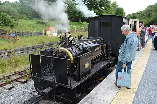 A group of railway enthusiasts bought the old trackbed at Henllan and, in 1983, laid a 2 ft (610 mm) gauge track. The Teifi Valley Railway line originally ran from Henllan to Pontprenshitw, however in 1987 the line was extended as far as Llandyfriog and, since 2006, has been further extended to the current end of the line, known as Llandyfriog Riverside. In 2009, work proceeded to return the location of Henllan station to its original site and the platform was opened again to passenger use in July 2009.[4]