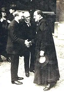 Henri Brémond (right) shakes hand with Alexandre Miniac (left) at the Académie Française, c. 1923.