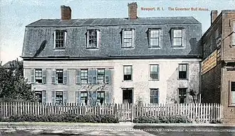 The Henry Bull house was located on the eastern side of Spring Street in Newport near modern-day Bull Street and Broadway. According to turn-of-the-twentieth-century research by Norman Isham, the back part of the stone house was built around 1639 by Henry Bull, a Quaker leader and one of the original settlers of Portsmouth and Newport. Bull served as a colonial militia officer and jail keeper. The original Newport jail may have been part of the house. Henry Bull died at the house in 1694 and was the last survivor of the original founders of Rhode Island. Large modifications were made to the house in later decades. Henry's son, Jireh Bull, constructed a large fortified house in South Kingstown, Rhode Island which was demolished during King Philip's War.[1] A fire burned and destroyed the Henry Bull House on December 29, 1912.[2][3][4]