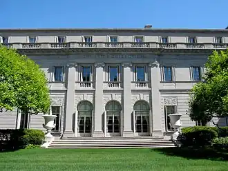 Most of the house, except for the gallery wing at the north end, is recessed 75 feet (23 m) behind a garden on Fifth Avenue.[25][26][27] This contrasted with similarly large mansions built in Manhattan during the early 20th century, which were generally built as close as possible to the boundaries of their lots.[26] Original plans called for a sunken garden facing Fifth Avenue, flanked by the house on two sides, with a pool in the center.[28][29] The William H. Jackson Company designed a wrought iron fence around the Fifth Avenue garden, while John Williams Inc. designed entrance gates in the same style.[30] When the house was completed, there was a stone wall with a balustrade along Fifth Avenue,[27] and the garden itself had evergreen trees.[31] There was a small formal garden at the south end of the Fifth Avenue garden, at the same level as the house's first floor.[32] Three magnolia trees were planted during a 1939 renovation;[33] by the late 20th century, the Fifth Avenue garden was cited as containing roses, violets, lantana, blue Egyptian lily, and white petunias.[34] The garden was rarely open to the public until the late 2000s.[35]