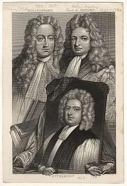 Bolingbroke pictured alongside the Earl of Oxford, together with a portrait of Francis Atterbury. Engraving after a painting by Sir Godfrey Kneller.