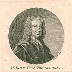 Henry St. John, 1st Viscount Bolingbroke (16 September 1678 – 12 December 1751) was a British Tory politician and philosopher. He was a leader of the Tories, and supported the Church of England politically despite his antireligious views and opposition to theology.[1][2][3][4][5] Bolingbroke supported the Jacobite rebellion of 1715, which sought to overthrow the new king George I. Escaping to France, he became foreign minister for the Jacobite pretender James Francis Edward Stuart. He was attainted for treason but reversed course and was allowed to return to England in 1723. According to Ruth Mack, "Bolingbroke is best known for his party politics, including the ideological history he disseminated in The Craftsman (1726–1735) by adopting the formerly Whig theory of the Ancient Constitution and giving it new life as an anti-Walpole Tory principle."[6]