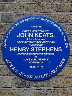 On 14 March 2002, as part of the 'Re-weaving Rainbows' event of National Science Week 2002, Poet Laureate Sir Andrew Motion unveiled a blue plaque on the front wall of 28 St Thomas Street to commemorate the sharing of lodgings there by Keats and Stephens while they were medical students at Guy's and St Thomas' Hospital in 1815–16.