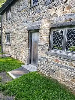 Accounts of the construction state that the local Menunkatuck Indians aided the settlers in the construction of the house by transporting stone from nearby quarries to the building site on hand barrows.[8] The walls of the house were made nearly two feet thick because there was so much stone available for construction.[7] The original mortar used to cement the stones was composed of yellow clay and crushed oyster shell, a technique developed by the lack of more conventional building materials.[8] Inside the great hall, the "joists and rafters were hand-hewn oaken timbers; the inside partitions were formed by wide planks of pine or white wood joined with feathered edges."[7]