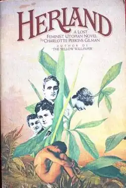 Herland is a 1915 feminist utopian novel written by American feminist Charlotte Perkins Gilman. The book describes an isolated society composed entirely of women, who bear children without men (parthenogenesis, a form of asexual reproduction). The result is an ideal social order: free of war, conflict, and domination. It was first published in monthly installments as a serial in 1915 in The Forerunner, a magazine edited and written by Gilman between 1909 and 1916, with its sequel, With Her in Ourland beginning immediately thereafter in the January 1916 issue. The book is often considered to be the middle volume in her utopian trilogy, preceded by Moving the Mountain (1911). It was not published in book form until 1979.