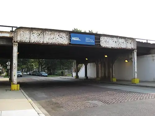 Hermosa was a station on Metra's Milwaukee District West Line. The station was located at 1800 North Keeler Avenue in the Hermosa neighborhood of Chicago, Illinois. Hermosa was 5.9 miles (9.5 km) from Union Station, the eastern terminus of the Milwaukee District West Line.[1] In Metra's zone-based fare system, Hermosa was located in zone B. On December 11, 2006, Hermosa and the nearby Cragin station were closed and replaced by the Grand/​Cicero station, which is located between both former stations. Hermosa station was also used by commuter trains of the Milwaukee Road, the predecessor to Metra.[2] Walt Disney's birthplace is located three blocks north of this station on Tripp Avenue. Hermosa was also the first station west of Metra's Pacific Junction (where the MD-W line joins the Milwaukee District North Line) which is a few feet from the station itself. Pacific Junction contains four tracks (three for Milwaukee District West trains going south to Chicago Union Station and one going north for Canadian Pacific Kansas City trains.)