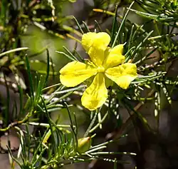 Hibbertia elata is an open shrub that typically grows to a height of 1–2 m (3 ft 3 in – 6 ft 7 in), its stems usually hairy. The leaves are arranged in clusters along the stems, linear to lance-shaped with the narrower end towards the base, 10–30 mm (0.39–1.18 in) long and 1–2 mm (0.039–0.079 in) wide. The flowers are arranged on the ends of short side shoots and are sessile, with five sepals about 8 mm (0.31 in) long. The five petals are yellow, about 10 mm (0.39 in) long and there are fifteen to twenty-five stamens arranged around three glabrous carpels. Flowering occurs from summer to autumn.[2]