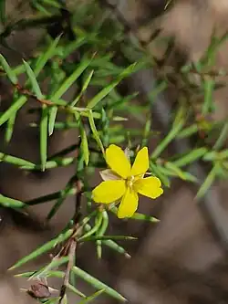 Hibbertia woronorana is a shrub that typically grows to a height of up to 1 m (3 ft 3 in) with glabrous foliage and many stiff, woody branches and stems. The leaves are linear, mostly 7–9 mm (0.28–0.35 in) long, 0.6–0.7 mm (0.024–0.028 in) wide on a petiole 0.2–0.5 mm (0.0079–0.0197 in) long, and with the edges curved downwards. The flowers are arranged singly on the ends of branches with linear bracts 0.6–0.8 mm (0.024–0.031 in) long at the base. The five sepal are joined at the base, the outer lobes 4.0–4.3 mm (0.16–0.17 in) long and 1.2–1.5 mm (0.047–0.059 in) wide, the inner lobes broader. The petals are yellow, lance-shaped with the narrower end towards the base, 3.9–5.0 mm (0.15–0.20 in) long with five or six stamens fused at the base on one side of two softly-hairy carpels, each carpel usually with two ovules. Flowering occurs from September to December.[2][3]