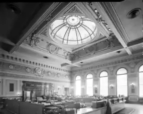 The Hibernia Bank,[2] headquartered in San Francisco, California, was founded in April 1859 as the Hibernia Savings and Loan Society.[3] In 1892, the company built a Beaux-Arts headquarters at 1 Jones Street at the corner of McAllister and Market Streets, designed by Albert Pissis. Slightly damaged in the 1906 earthquake and fire, it re-opened again just five weeks after the calamity; Pissis designed an addition to the building in 1908.