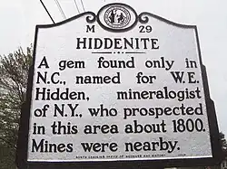 The first discovery of the hiddenite stone was made in 1879 by W. E. Hidden. Samples were sent to Dr. J. Lawrence Smith in Louisville, Kentucky, who determined that the stone Hidden had collected was spodumene. The variety was given the name hiddenite.[1] Emeralds had earlier been found during ploughing in 1874.