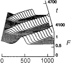 Such undeformed moving domains in crystals with slit electrodes are bands parallel to the electrodes, and seen by the oscillating field, when plotted in a x,F,t diagram give the optical impression of bifurcation (Fig. 8).[6]