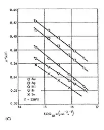 Since the high field domain starts at the electron density given by the work-function at the cathode and pulls the Schottky barrier open to a constant field in the domain, this work function can be determined precisely, and it can be used as a tool to determine the changes of the work function, as it varies depending on external parameters. As an example, it can be shown that it depends on the optical excitation in a photoconductor (See Fig. 5).[11]