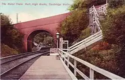 The original High Rocks Halt opened on 1 June 1907, as part of a London, Brighton and South Coast Railway scheme to boost traffic on its lines.[2] It finally closed on 5 May 1952 due to low traffic (it had been closed from 16 October 1939 to 15 June 1942 as a wartime economy measure). The rest of the line soldiered on with ever-decreasing services, to be finally closed to all traffic on 10 August 1985.[2]