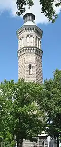 The High Bridge Water Tower, in the park between West 173rd and 174th Streets, was built in 1866–1872 to help meet the increasing demands on the city's water system. The 200-foot (61 m)-tall octagonal tower was designed by John B. Jervis in a mixture of Romanesque Revival and neo-Grec styles, and was accompanied by the 7-acre (2.8 ha) Highbridge Reservoir. The High Bridge system was inaugurated in 1872, and reached its full capacity by 1875.[47] With the opening of the Croton Aqueduct, the High Bridge system became less relied upon; during World War I it was taken out of service when sabotage was feared.[47] In 1949 the tower was disconnected from the system,[47][72] and a carillon, donated by the Altman Foundation, was installed in 1958.[47] The tower's cupola was damaged by an arson fire in 1984. The tower and cupola were rehabilitated and restored in 1989–1990.[47] The High Bridge Water Tower was designated a New York City landmark by the Landmarks Preservation Commission in 1967. The High Bridge Water Tower underwent a 10 year, $5 million renovation, and reopened to the public for scheduled tours in November 2021. [73] Tours are free through NYC Parks Department and usually take place several times a month.