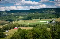 Highland County has no public airfields; however, there is a private airfield located within the county south of Monterey.[49] Commercial air transportation is available at the Shenandoah Valley Regional Airport in neighboring Augusta County, Virginia.[58] Highland County also lacks any rail lines; the nearest railroad is a CSX Transportation line located in Augusta County, which also provides passenger rail service via Amtrak in Staunton.[49] Historically, no permanent rail lines ever existed within the county's borders, though several were proposed. In the 1870s, there were prospects of a railroad named the Washington, Cincinnati, and St. Louis Railroad entering the county. This line was proposed as a narrow gauge railroad to be built from Harrisonburg, Virginia to Monterey and then westward into West Virginia, eventually reaching western markets. The railroad, which has been described as being "so poorly conceived that its failure was inevitable", was never built.[59] Another potential railroad to enter Highland County was chartered by the Virginia General Assembly on February 29, 1892, as the Augusta, Highland, and Alleghany Railroad. This railroad was to connect with either the Chesapeake and Ohio Railway or Valley Railroad in Augusta County and build a line towards Monterey.[60][61] The Augusta, Highland, and Alleghany Railroad appears to have never been organized or built, as documents from 1911 and 1922 state that no railroad existed in the county.[62][63] The prospects of a railroad reaching Highland were limited due to the mountainous terrain and a general lack of sufficient traffic to make such an investment economically viable.[63]