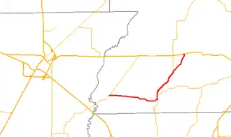 Highway 168 begins at Highway 228 at Fontaine and runs east. The route runs through Loredo before forming a concurrency with Highway 141 (Crowley's Ridge Parkway) north to Walcott. Highway 141 continues north at a fork in the road, while Highway 168 turns northeast to Crowley's Ridge State Park. The Crowley's Ridge Parkway designation changes at this fork, following Highway 168 through the park.[3] In the park, Highway serves the Crowley's Ridge Bathhouse, Comfort Station, Dining Hall, a historic bridge, and Walcot Lake. Further north, Highway 168 continues to US 412, where it terminates.