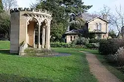 There is a disused chapel located on the east side of the park, It is a Grade II* listed building.[8] It is the chancel of the Leper's hospital chapel founded around the 12th century, the rest of the hospital stood on the opposite side of London Road. There are many carvings on the walls of the chapel which may have been made by pilgrims which may represent various saints days or religious festivals. The symbols include a fleur-de-lys, a star of epiphany, symbols representing the Feast of the Cross, the feast of St Valentine and All Saints' Day. The nave of the chapel was demolished in 1861. At this time the south and west doorways were taken down and reassembled in the chancel. The south doorway has flowers and rosettes carved into it, with cable and pellet symbols. There is a life-sized 13th-century effigy of Kyneburga, a Saxon princess.[9]