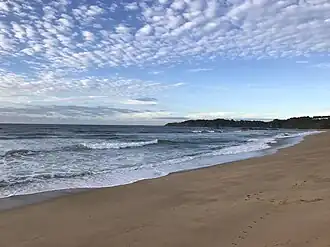 Hills Beach (also known as Opal Cove Beach) is a beach on Korora Bay, located in the city of Coffs Harbour, New South Wales.[1] It is a steep, reflective beach, around 600m long.[1] At its southern end, Hills Beach is bounded by rocks separating it from the neighbouring Korora Beach.[1] Also near the southern end, there is a small creek crossing the beach and a sandy tombolo stretching out to rocks in the sea.[1][2] At the northern end, the beach is bounded by Pine Brush Creek, which has an intermittently open entrance to the sea, and by steep rocks which separate it from the small (150m long) secluded Hills North Beach.[2][3] The sea off the beach is part of the Solitary Islands Marine Park and is a Habitat Protection Zone.[4] The Solitary Islands Coastal Walk, which goes from Red Rock to Sawtell (60 km), runs through Hills Beach.[5]