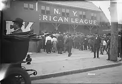 American League baseball came to New York City in 1903 when gambler Frank J. Farrell and former New York City Police Chief William S. Devery bought the Baltimore Orioles franchise for $18,000, equal to $629,933 today. They established the team at Hilltop Park, a hastily constructed wooden park seating about 16,000 fans, on the west side of Broadway between 165th and 168th streets. It was catty-corner to the New York School for the Deaf, which at that time was located at 99 Fort Washington. The land was acquired via a ten-year lease, arranged by the New York Institution for the Blind.[3]