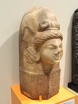 Gandhara, a region encompassing the South-east of Afghanistan, was influenced by Vedism since the post-Vedic Period (c. 1500 – c. 1200 BCE), and later became an important center of Buddhism.[20][21][22] Later forms of Hinduism were also prevalent in this south-eastern region of the country during the Turk shahis, with Khair Khaneh, a Brahmanical temple being excavated in Kabul and a statue of Gardez Ganesha being found in Paktia province.[23] Most of the remains, including marble statuettes, date to the 7th–8th century, during the time of the Turk Shahi.[24][25][26] The statue of Ganesha from Gardez is now attributed to the period of Turk Shahis in the 7-8th century CE, rather than to their successors the Hindu Shahis (9th-10th century) as has also been suggested.[27] The dating is essentially based on stylistic analysis, as the statue displays great iconographical and stylistic similarities with the works of the Buddhist monastery of Fondukistan, which is also dated to the same period.[27] Hinduism further flourished under the rule of Hindu Shahis, but went into sharp decline with the advent of Islam through the Ghaznavids, who defeated the Shahis. Nonetheless, it continued as a significant minority in Afghanistan until the 21st century, when its number of followers fell to a few hundred.[28][29][30]