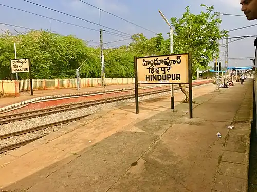 Hindupur railway station (station code:HUP[1]) is a railway station located in Hindupur, Sri Sathya Sai district, Andhra Pradesh. Its code is HUP. 2 Passenger Trains starts from Hindupur to Bangalore and Gunakal in morning and same returns to Hindupur in evening. Hindupur - Kadiri new route survey done and later cancelled by lack of support from local political interest.[2] The station is administered under Bangalore division of South Western Railway zone.[3][4]