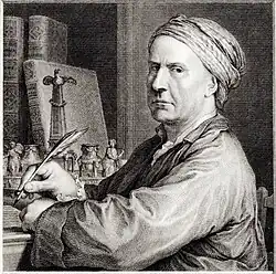 Portrait of Guillaume-Thomas Raynal signing the third edition