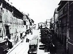 The present-day Corso Giacomo Matteotti in a photo postcard dated after the opening of the Tramways of the Roman Castles (1906) but before the demolition of the church of San Rocco (in the background) and Palazzo Doria for the opening of Piazza Giuseppe Mazzini (1951).