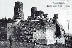 The so-called tomb "of the Horatii and Curiatii," one of the symbols of Albano. About 5.40 meters long on each side, the podium is about 3 meters high, while the four side cones (only one of which is still whole) are just over 2 meters high: their diameter is about 1.50 meters, while of the central cone only the diameter, about 3 meters, can be calculated.[3]