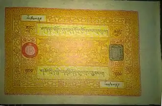In 1937 or '38 new multicolored notes with the high denomination 100 tam srang were introduced. They bear the same octagonal red seal as the early "tam" denominated notes and a black seal of a new type which bears the following inscription: Srid zhi dpal ´bar.[20][21]