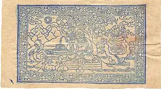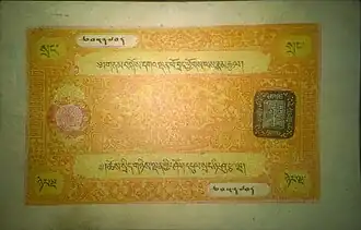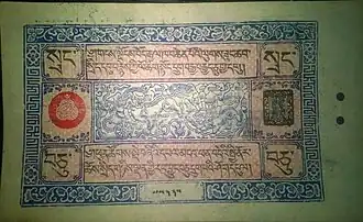 The highest denomination note (50 tam) was often forged, and the Tibetan government decided to introduce a new multicoloured version printed in a more sophisticated manner. The legends on the obverse were printed from woodblocks, while the remaining design on both sides was machine-printed using several different metal blocks. The first notes of this new issue were dated T.E. 1672 (= AD 1926). New notes of this denomination were produced every year until T.E. 1687 (= AD 1941).[20][21]