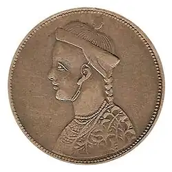 During the second part of the 19th and the first third of the 20th century numerous foreign silver coins circulated in Tibet. Most of them were traded by weight, such as Mexican and Spanish American silver dollars, Russian roubles and German marks. The exception were British Indian rupees, particularly the ones with the portrait of Queen Victoria, which widely circulated in Tibet and were mostly preferred to Tibetan coins. These rupees were of good silver and had a fixed value, exchanging for three tangkas until about 1920[17] and in later years of the 20th century they considerably increased in value. The Chinese authorities saw the popularity of the Indian rupees among Tibetan traders with misgivings and in 1902 started striking their own rupees which were close copies of the Indian Victoria rupees, the portrait of the Queen being replaced by that of a Chinese mandarin, or, as most numismatists believe, of the Guangxu Emperor of China. The Chinese rupees were struck in Chengdu and, starting in the 1930s also in Kangding, the former Tibeto-Chinese border town in western Sichuan. The first issues were of good silver and could gain a certain popularity among the Tibetans, but later issues, particularly the ones minted in Kangding, had a considerable amount of alloy, and were therefore not accepted by many traders. In the early minting-period also a small number of half and quarter rupees were struck in Chengdu. Since they often ended up as buttons or as parts of silver jewellery, their production was soon discontinued, and, when small change was needed, the whole rupees were cut in half or were quartered with the help of a sword and a hammer.[18] The total mintage figure of the half rupees was 130,000 and that of the quarter rupees 120,000. It is estimated that between 25,500,000 and 27,500,000 Sichuan rupees were minted between 1902 and 1942.[19]