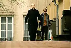 One of Stuhr's four characters: a priest with his daughter.