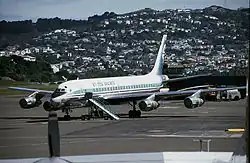 Air New Zealand Douglas DC-8 at Wellington Airport in 1980