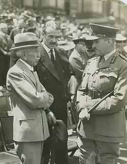 Stanley Bruce became Prime Minister in 1923, when members of the Nationalist Party Government voted to remove W.M. Hughes. Speaking in early 1925, Bruce summed up the priorities and optimism of many Australians, saying that "men, money and markets accurately defined the essential requirements of Australia" and that he was seeking such from Britain.[76] The migration campaign of the 1920s, operated by the Development and Migration Commission, brought almost 300,000 Britons to Australia,[77] although schemes to settle migrants and returned soldiers "on the land" were generally not a success. "The new irrigation areas in Western Australia and the Dawson Valley of Queensland proved disastrous".[78]