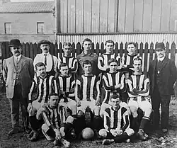 By 1891, the club was struggling heavily financially. As a consequence,[8] it was put forward that Bath AFC amalgamate with the local rugby club; Bath Football Club.[9] For an entire nine years the club ceased play. Until, on 11 September 1900, Bath AFC was re-formed by members of the Bath Association Cricket Club, led by eventual player, William Hyman. A large meeting was called at the Railway Hotel, on James Street in the city centre, to discuss, and in a viable form, an association football team to represent the city of Bath.[10] The meeting was a success and Bath City FC,[11] by name, was officially born.[1] Hyman went on to score 131 goals for Bath in the early 20th century, making him, to this day, the club's second all-time top goal scorer,[12] he also frequently acted as the club's honorary secretary in board meetings.[13] The headquarters and changing rooms would be near the ground at the Belvoir Castle pub.[14]
